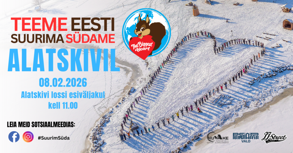 KUVAKE kutsub vallarahvast sõbrapäeva eel, 8. veebruaril kell 11 Alatskivi lossi esiväljakule, et taas moodustada Peipsiääre valda Eesti Suurim Süda. Tulge perede ja sõpradega, tulge valla igast kandist – meid mahub siia palju!