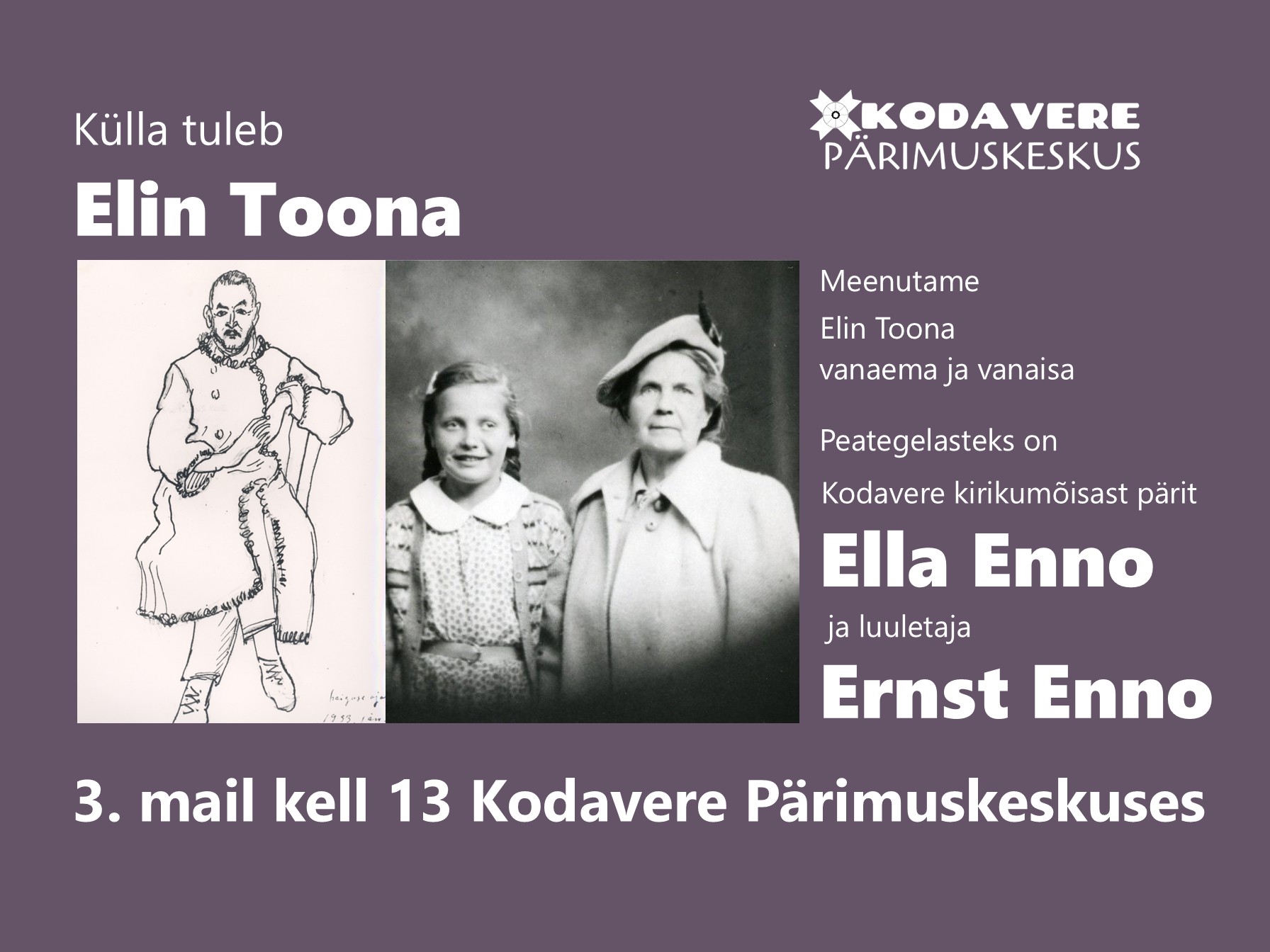 3. mail kell 13 tuleb Kodavere pärimuskeskusesse külla Elin Toona.