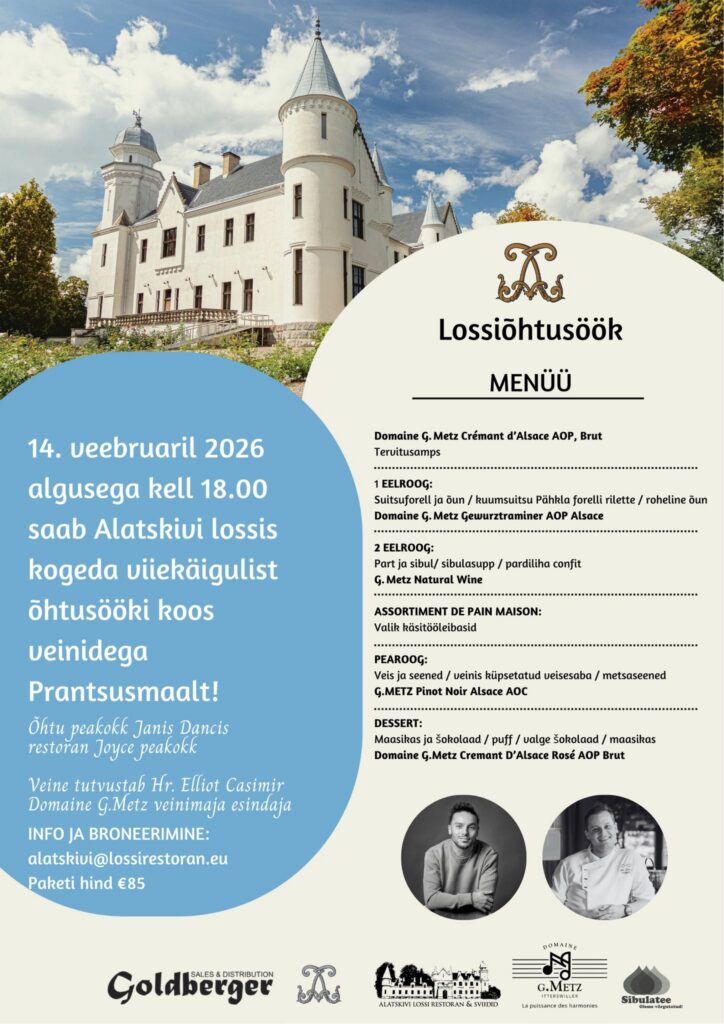 Sõbrapäeval, 14. veebruaril algusega kell 18 saab Alatskivi lossis nautida taas viiekäigulist õhtusööki koos veinidega Prantsusmaalt!