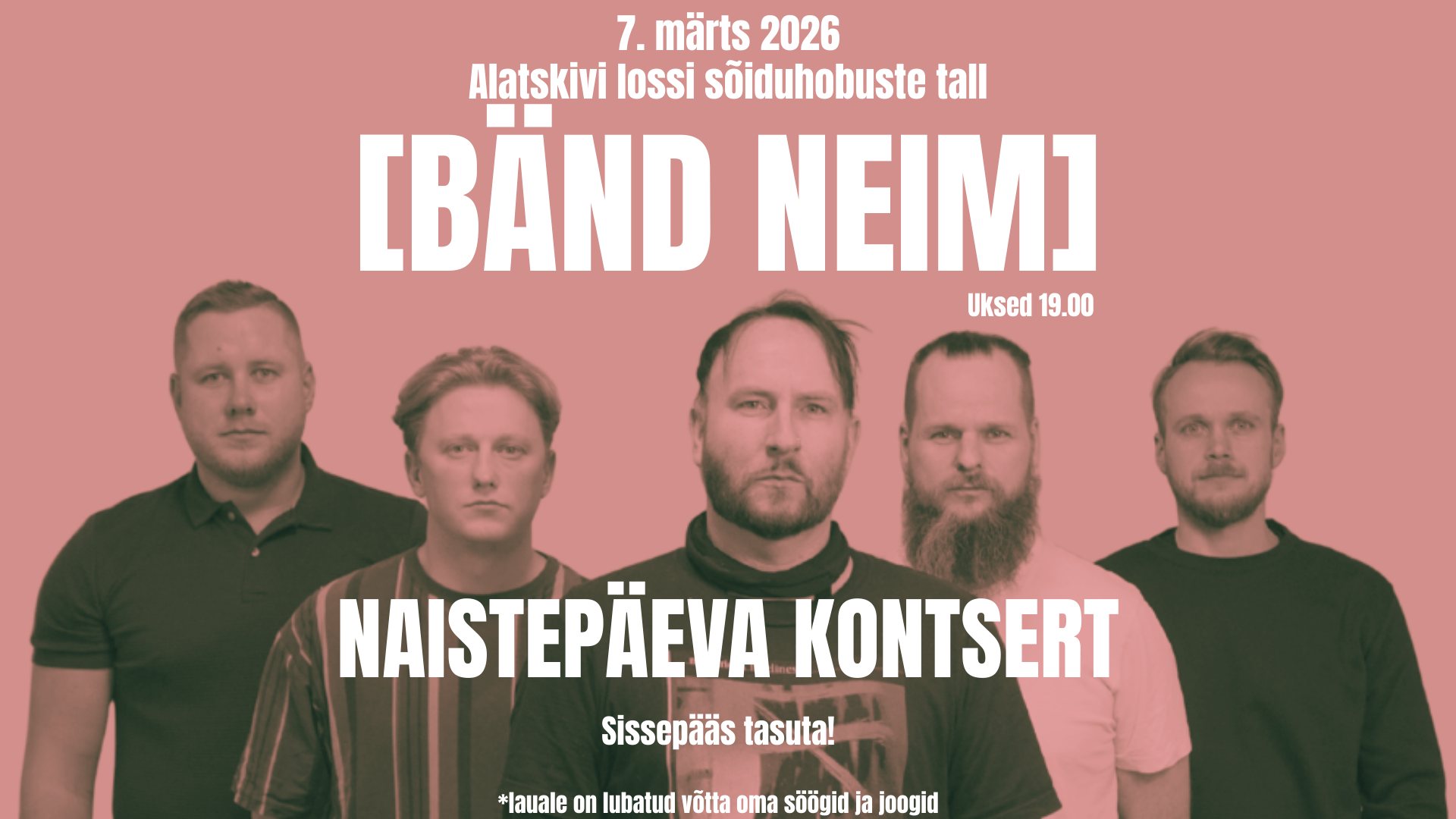 7. märtsil kell 19 muutub Alatskivi lossi sõiduhobuste tall paigaks, kus kõlab trumm ja kitarr ning tantsusammud ei küsi luba. Laval astub üles kohalikest meestest koosnev [BÄND NEIM] – jah, nad on päriselt olemas ja jah, nad teevad päriselt head muusikat.