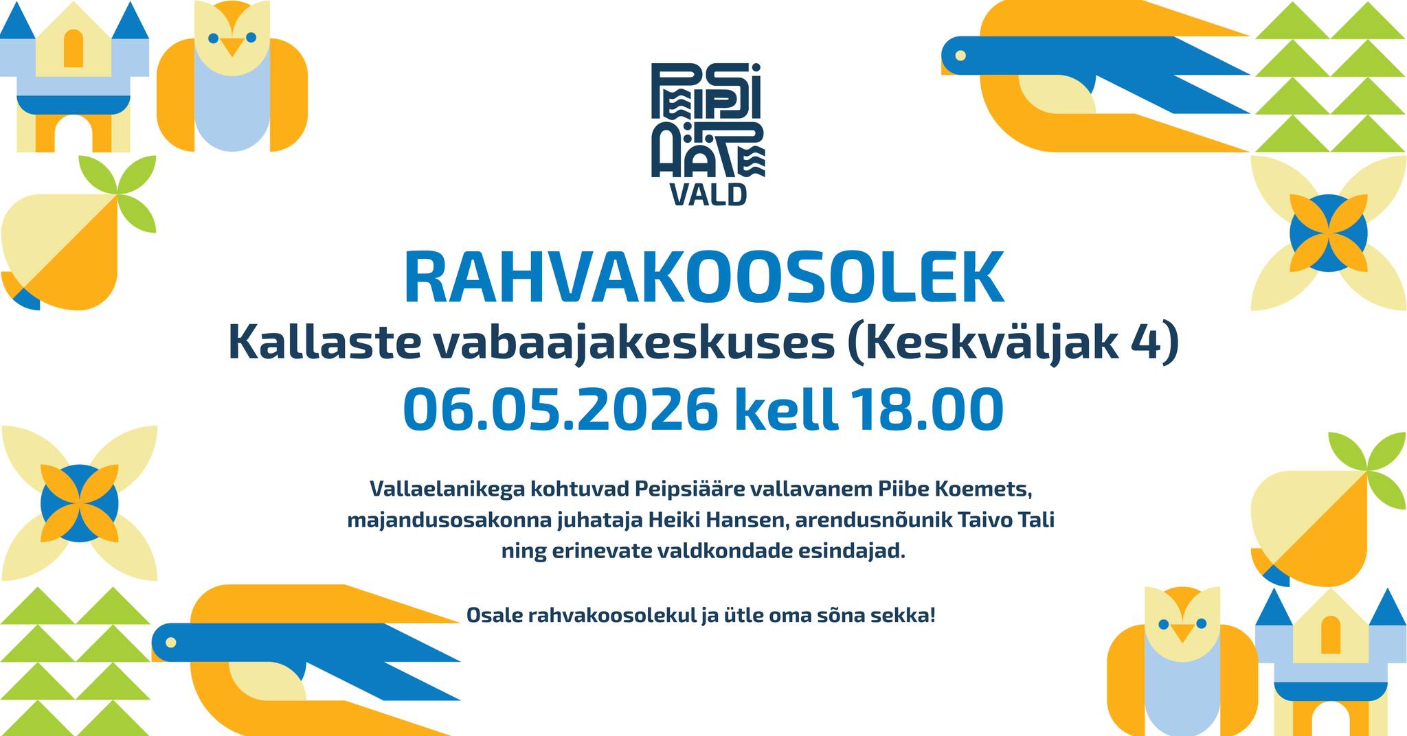 Kas soovid kaasa rääkida kogukonna tegemistes ja valla arengutes? Aprillis ja mais korraldab Peipsiääre Vallavalitsus valla eri paikades rahvakoosolekuid, kus osalevad vallavanem Piibe Koemets, majandusosakonna juhataja Heiki Hansen, arendusnõunik Taivo Tali ning erinevate valdkondade esindajad.