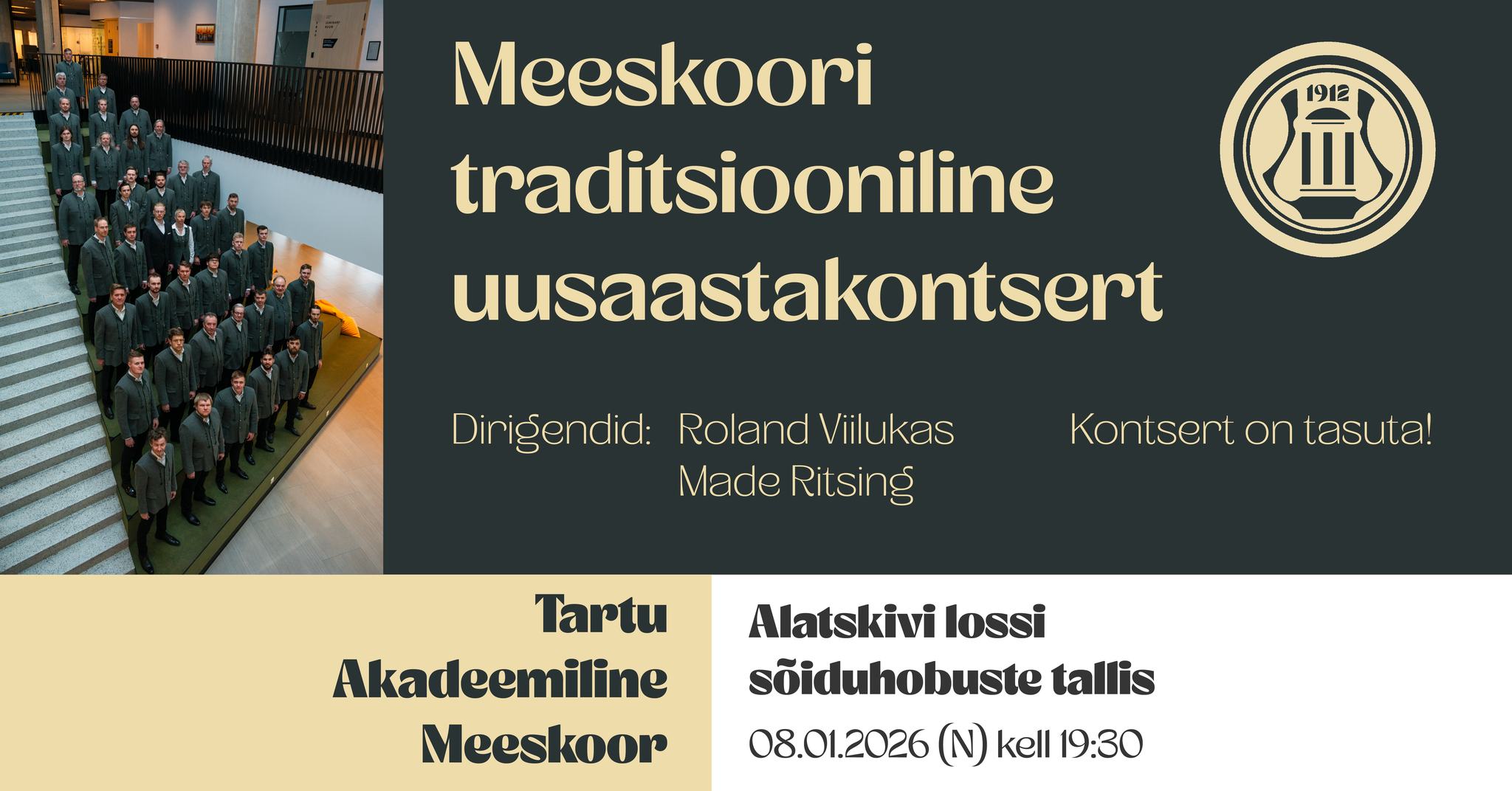 Tartu Akadeemilise Meeskoori traditsiooniline uusaastakontsert toimub 8. jaanuaril 2026 kell 19.30 Alatskivi lossi sõiduhobuste tallis.